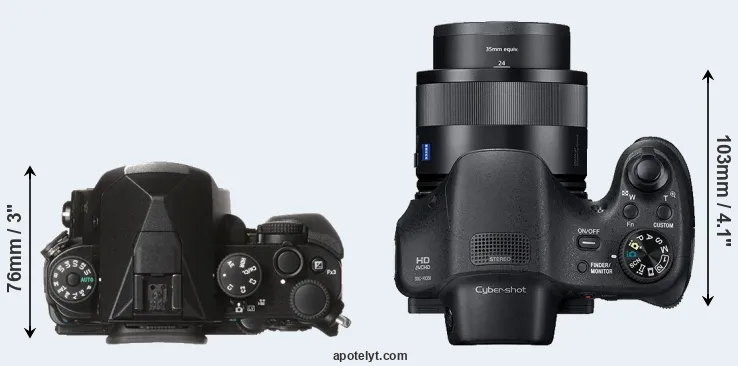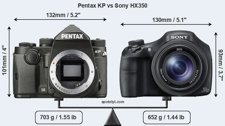 The physical size and weight of the Pentax KP and the Sony HX350 are illustrated in the side-by-side display below. The two cameras are presented according to their relative size. Three consecutive views from the front, the top, and the rear side are shown. All width, height and depth dimensions are rounded to the nearest millimeter.
