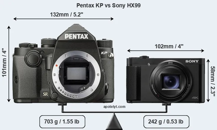 The physical size and weight of the Pentax KP and the Sony HX99 are illustrated in the side-by-side display below. The two cameras are presented according to their relative size. Three successive views from the front, the top, and the rear are shown. All width, height and depth dimensions are rounded to the nearest millimeter.