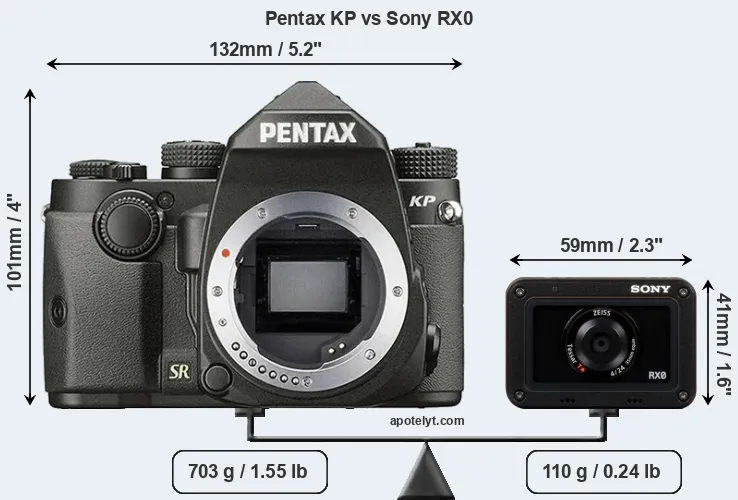 The Pentax KP and the Sony Cyber-shot DSC-RX0 are two digital cameras that were revealed to the public, respectively, in January 2017 and August 2017. The KP is a DSLR, while the RX0 is a fixed lens compact. The cameras are based on an APS-C (KP) and an one-inch (RX0) sensor. The Pentax has a resolution of 24.1 megapixels, whereas the Sony provides 15.4 MP.