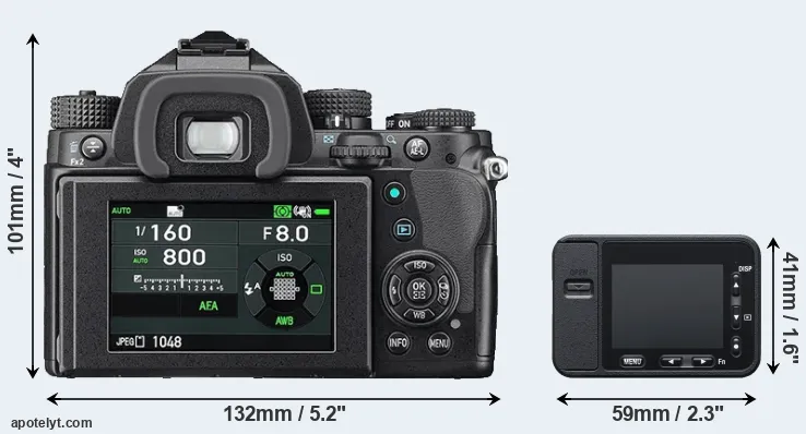 | 1. | Pentax KP | 132 mm | 101 mm | 76 mm | 703 g | 390 | Y | Jan 2017 | EUR 1 299 | ebay.com | |