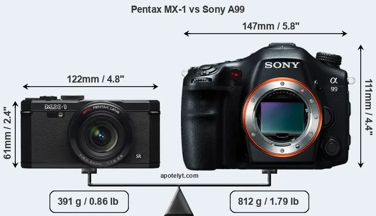 If the front view area (width x height) of the cameras is taken as an aggregate measure of their size, the Sony A99 is considerably larger (119 percent) than the Pentax MX-1. It is noteworthy in this context that the A99 is splash and dust-proof, while the MX-1 does not feature any corresponding weather-sealing.
