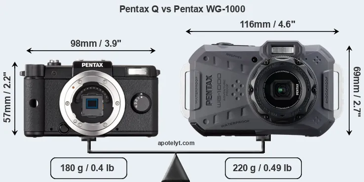 The above size and weight comparisons are to some extent incomplete and possibly misleading, as the WG-1000 has a lens built in, whereas the Pentax Q is an interchangeable lens camera that requires a separate lens. Attaching the latter will add extra weight and bulk to the setup.