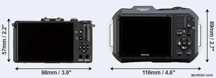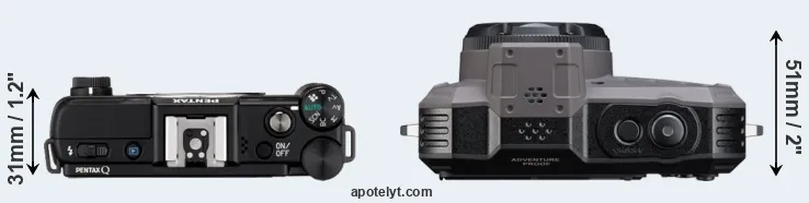 The side-by-side display below illustrates the physical size and weight of the Pentax Q and the Pentax WG-1000. The two cameras are presented according to their relative size. Three successive views from the front, the top, and the rear are shown. All width, height and depth measures are rounded to the nearest millimeter.