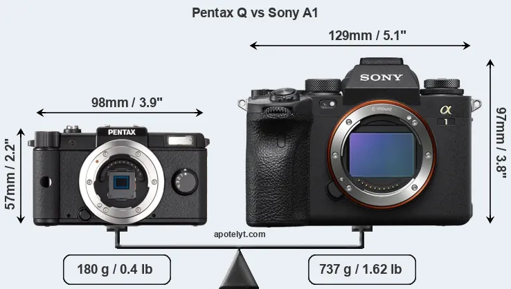 If the front view area (width x height) of the cameras is taken as an aggregate measure of their size, the Sony A1 is considerably larger (124 percent) than the Pentax Q. Moreover, the A1 is substantially heavier (309 percent) than the Pentax Q. It is noteworthy in this context that the A1 is splash and dust-proof, while the Pentax Q does not feature any corresponding weather-sealing.