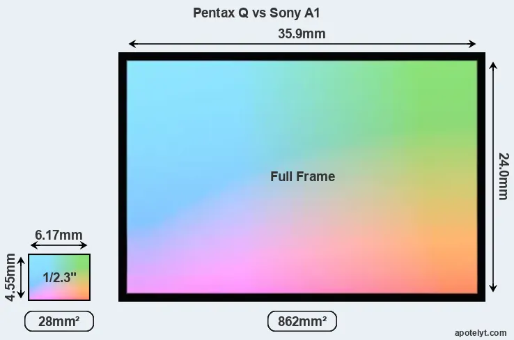Of the two cameras under consideration, the Pentax Q features a 1/2.3-inch sensor and the Sony A1 a full frame sensor. The sensor area in the A1 is 2979 percent bigger. As a result of these sensor size differences, the cameras have a format factor of, respectively, 5.6 and 1.0. The sensor in the Pentax Q has a native 4:3 aspect ratio, while the one in the A1 offers a 3:2 aspect.