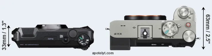 If the front view area (width x height) of the cameras is taken as an aggregate measure of their size, the Sony A7C R is notably larger (13 percent) than the Pentax WG-8. In this context, it is worth noting that both cameras are splash and dust-proof and can, hence, be used in inclement weather conditions or harsh environments. More than that, the WG-8 is water-proof up to 20m and can, thus, be used for underwater photography.