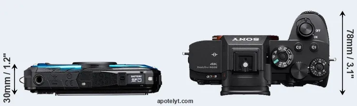 An illustration of the physical size and weight of the Pentax WG-90 and the Sony A7R IVA is provided in the side-by-side display below. The two cameras are presented according to their relative size. Three consecutive perspectives from the front, the top, and the back are available. All width, height and depth dimensions are rounded to the nearest millimeter.