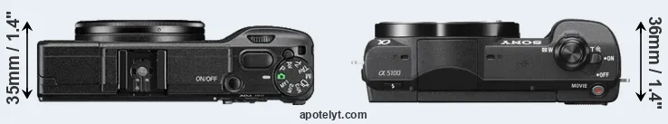 An illustration of the physical size and weight of the Ricoh GR II and the Sony A5100 is provided in the side-by-side display below. The two cameras are presented according to their relative size. Three consecutive perspectives from the front, the top, and the back are available. All width, height and depth measures are rounded to the nearest millimeter.