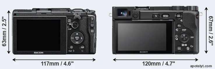 The physical size and weight of the Ricoh GR II and the Sony A6100 are illustrated in the side-by-side display below. The two cameras are presented according to their relative size. Three successive views from the front, the top, and the rear are shown. All width, height and depth dimensions are rounded to the nearest millimeter.