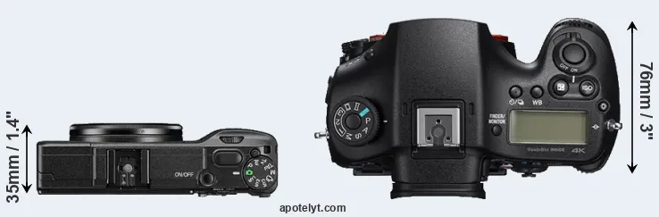 The above size and weight comparisons are to some extent incomplete and possibly misleading, as the GR II has a lens built in, whereas the A99 II is an interchangeable lens camera that requires a separate lens. Attaching the latter will add extra weight and bulk to the setup.