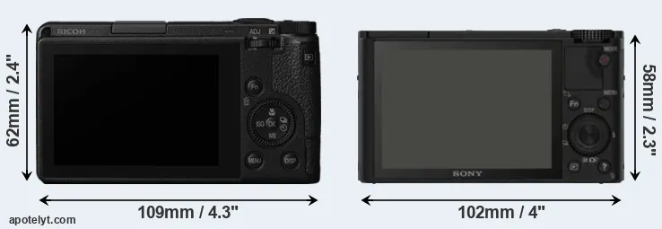 The side-by-side display below illustrates the physical size and weight of the Ricoh GR III and the Sony RX100. The two cameras are presented according to their relative size. Three consecutive perspectives from the front, the top, and the back are available. All width, height and depth measures are rounded to the nearest millimeter.