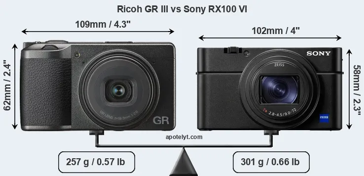 The side-by-side display below illustrates the physical size and weight of the Ricoh GR III and the Sony RX100 VI. The two cameras are presented according to their relative size. Three consecutive perspectives from the front, the top, and the back are available. All width, height and depth measures are rounded to the nearest millimeter.