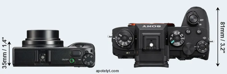 An illustration of the physical size and weight of the Ricoh GR IIIx and the Sony A1 is provided in the side-by-side display below. The two cameras are presented according to their relative size. Three consecutive perspectives from the front, the top, and the back are available. All width, height and depth measures are rounded to the nearest millimeter.