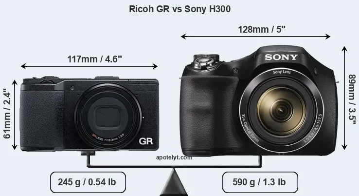 An illustration of the physical size and weight of the Ricoh GR and the Sony H300 is provided in the side-by-side display below. The two cameras are presented according to their relative size. Three consecutive perspectives from the front, the top, and the back are available. All width, height and depth measures are rounded to the nearest millimeter.