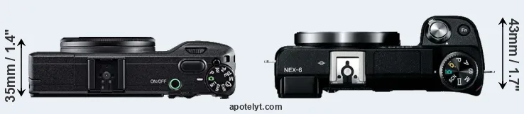 The side-by-side display below illustrates the physical size and weight of the Ricoh GR and the Sony NEX-6. The two cameras are presented according to their relative size. Three consecutive perspectives from the front, the top, and the back are available. All size dimensions are rounded to the nearest millimeter.