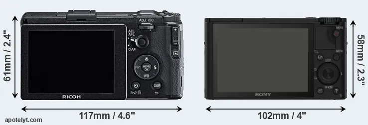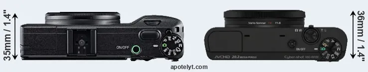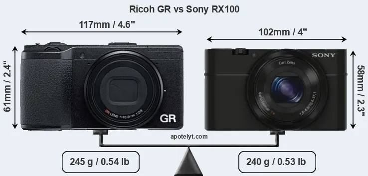 The side-by-side display below illustrates the physical size and weight of the Ricoh GR and the Sony RX100. The two cameras are presented according to their relative size. Three consecutive perspectives from the front, the top, and the back are available. All width, height and depth measures are rounded to the nearest millimeter.