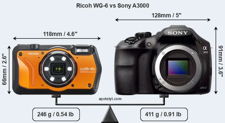 The side-by-side display below illustrates the physical size and weight of the Ricoh WG-6 and the Sony A3000. The two cameras are presented according to their relative size. Three consecutive perspectives from the front, the top, and the back are available. All size dimensions are rounded to the nearest millimeter.