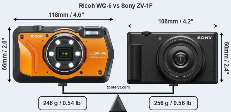 An illustration of the physical size and weight of the Ricoh WG-6 and the Sony ZV-1F is provided in the side-by-side display below. The two cameras are presented according to their relative size. Three successive views from the front, the top, and the rear are shown. All width, height and depth dimensions are rounded to the nearest millimeter.