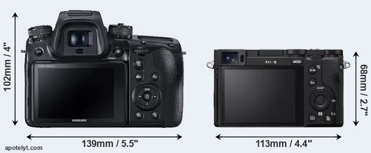 If the front view area (width x height) of the cameras is taken as an aggregate measure of their size, the Sony RX1R III is considerably smaller (46 percent) than the Samsung NX1. In this context, it is worth noting that both cameras are splash and dust-proof and can, hence, be used in inclement weather conditions or harsh environments.