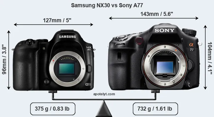 If the front view area (width x height) of the cameras is taken as an aggregate measure of their size, the Sony A77 is notably larger (22 percent) than the Samsung NX30. Moreover, the A77 is substantially heavier (95 percent) than the NX30. It is noteworthy in this context that the A77 is splash and dust-proof, while the NX30 does not feature any corresponding weather-sealing.