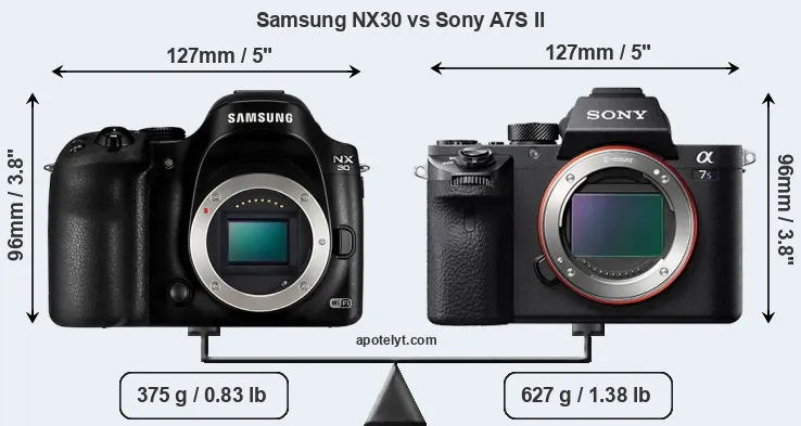 In this particular case, the Samsung NX30 and the Sony A7S II have exactly the same width and height, and, thus, have identically-sized bodies. However, the Sony is substantially heavier (67 percent) than the Samsung. It is noteworthy in this context that the A7S II is splash and dust-proof, while the NX30 does not feature any corresponding weather-sealing.