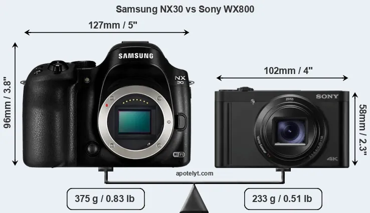 The above size and weight comparisons are to some extent incomplete and possibly misleading, as the WX800 has a lens built in, whereas the NX30 is an interchangeable lens camera that requires a separate lens. Attaching the latter will add extra weight and bulk to the setup.