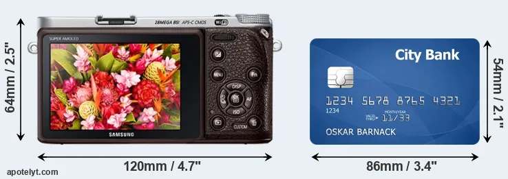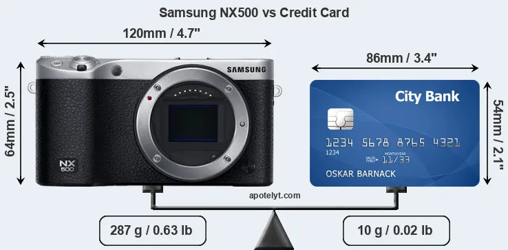 The physical dimensions of the Samsung NX500 relative to a credit card are illustrated in the side-by-side display below. Three consecutive perspectives from the front, the top, and the back are presented. All width, height and depth dimensions are rounded to the nearest millimeter.