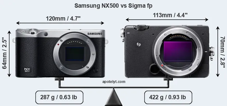 If the front view area (width x height) of the cameras is taken as an aggregate measure of their size, the Sigma fp is somewhat larger (3 percent) than the Samsung NX500. Moreover, the fp is substantially heavier (47 percent) than the NX500. It is noteworthy in this context that the fp is splash and dust-proof, while the NX500 does not feature any corresponding weather-sealing.