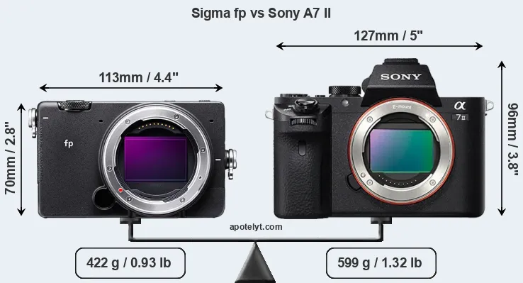The Sigma fp and the Sony Alpha A7 II are two digital cameras that were officially introduced, respectively, in July 2019 and November 2014. Both the fp and the A7 II are mirrorless interchangeable lens cameras that are equipped with a full frame sensor. Both cameras offer a resolution of 24 megapixels.