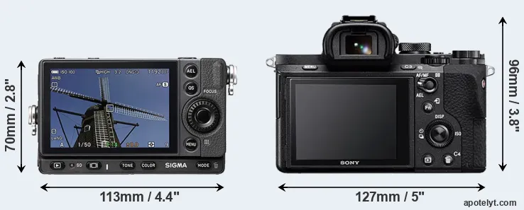 The physical size and weight of the Sigma fp and the Sony A7 II are illustrated in the side-by-side display below. The two cameras are presented according to their relative size. Three consecutive perspectives from the front, the top, and the back are available. All size dimensions are rounded to the nearest millimeter.