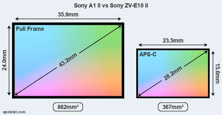 Of the two cameras under consideration, the Sony A1 II features a full frame sensor and the Sony ZV-E10 II an APS-C sensor. The sensor area in the ZV-E10 II is 57 percent smaller. As a result of these sensor size differences, the cameras have a format factor of, respectively, 1.0 and 1.5. Both cameras have a native aspect ratio (sensor width to sensor height) of 3:2.