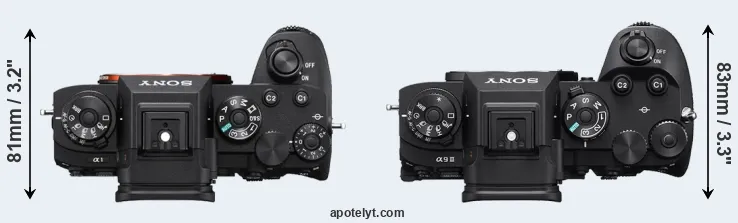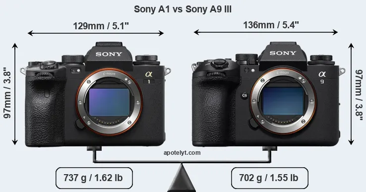 The physical size and weight of the Sony A1 and the Sony A9 III are illustrated in the side-by-side display below. The two cameras are presented according to their relative size. Three consecutive perspectives from the front, the top, and the back are available. All size dimensions are rounded to the nearest millimeter.