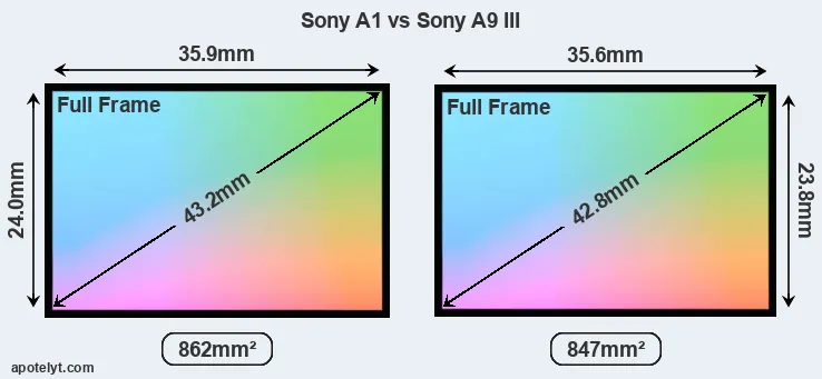 Both cameras under consideration feature a full frame sensor, but their sensors differ slightly in size. The sensor area in the A9 III is 2 percent smaller. They nevertheless have the same format factor of 1.0. Both cameras have a native aspect ratio (sensor width to sensor height) of 3:2.