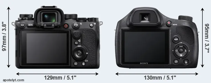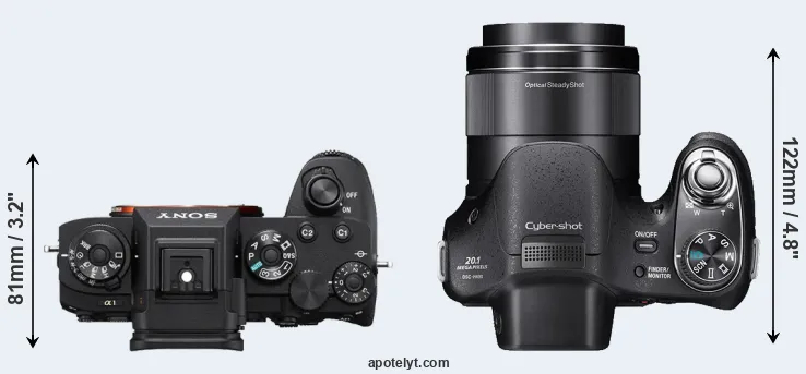 If the front view area (width x height) of the cameras is taken as an aggregate measure of their size, the Sony H400 is somewhat smaller (1 percent) than the Sony A1. It is worth mentioning in this context that the A1 is splash and dust resistant, while the H400 does not feature any corresponding weather-sealing.