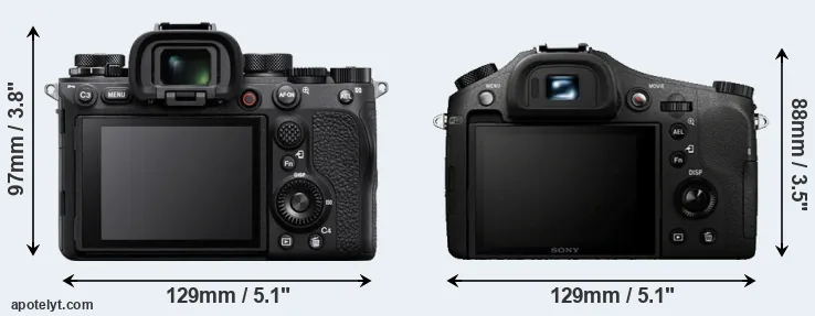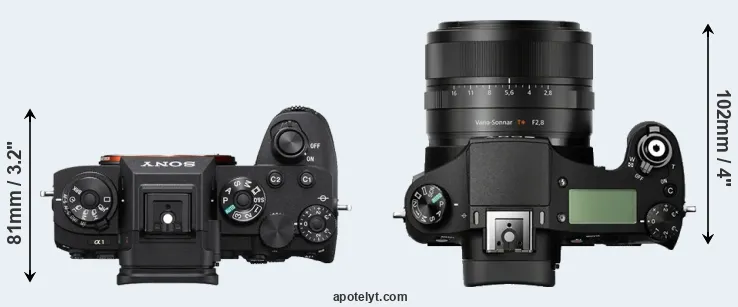 The physical size and weight of the Sony A1 and the Sony RX10 are illustrated in the side-by-side display below. The two cameras are presented according to their relative size. Three successive views from the front, the top, and the rear are shown. All width, height and depth measures are rounded to the nearest millimeter.