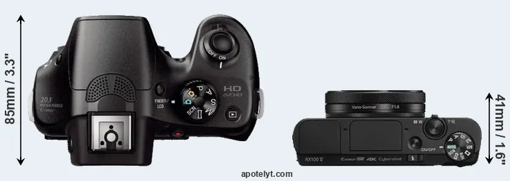 The physical size and weight of the Sony A3000 and the Sony RX100 V are illustrated in the side-by-side display below. The two cameras are presented according to their relative size. Three consecutive views from the front, the top, and the rear side are shown. All size dimensions are rounded to the nearest millimeter.