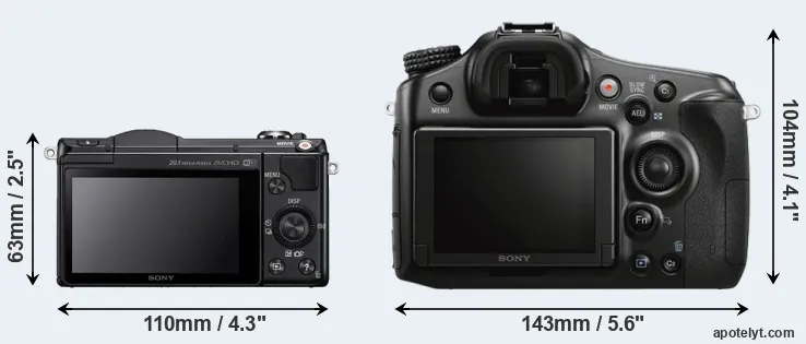 The side-by-side display below illustrates the physical size and weight of the Sony A5000 and the Sony A68. The two cameras are presented according to their relative size. Three consecutive views from the front, the top, and the rear side are shown. All width, height and depth dimensions are rounded to the nearest millimeter.