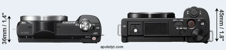 The side-by-side display below illustrates the physical size and weight of the Sony A5000 and the Sony ZV-E10. The two cameras are presented according to their relative size. Three successive views from the front, the top, and the rear are shown. All size dimensions are rounded to the nearest millimeter.