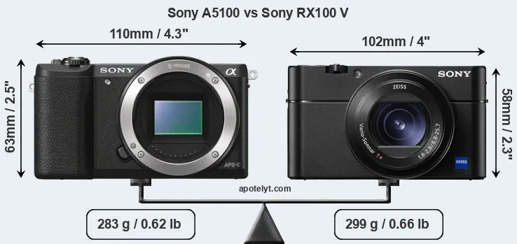An illustration of the physical size and weight of the Sony A5100 and the Sony RX100 V is provided in the side-by-side display below. The two cameras are presented according to their relative size. Three successive views from the front, the top, and the rear are shown. All width, height and depth measures are rounded to the nearest millimeter.
