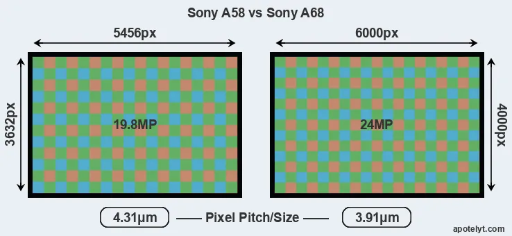While the two cameras under review share the same sensor size, the A68 offers a higher resolution of 24 megapixels, compared with 19.8 MP of the A58. This megapixels advantage translates into a 10 percent gain in linear resolution. On the other hand, these sensor specs imply that the A68 has a higher pixel density and a smaller size of the individual pixel (with a pixel pitch of 3.91μm versus 4.31μm for the A58). However, it should be noted that the A68 is much more recent (by 2 years and 8 months) than the A58, and its sensor will have benefitted from technological advances during this time that compensate for the smaller pixel size.