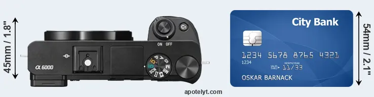 The physical dimensions of the Sony A6000 relative to a credit card are illustrated in the side-by-side display below. Three consecutive perspectives from the front, the top, and the back are presented. All width, height and depth dimensions are rounded to the nearest millimeter.