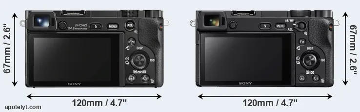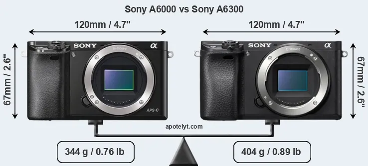 In this particular case, the Sony A6000 and the Sony A6300 have exactly the same width and height, and, thus, have identically-sized bodies. However, the A6300 is markedly heavier (17 percent) than the A6000. It is noteworthy in this context that the A6300 is splash and dust-proof, while the A6000 does not feature any corresponding weather-sealing.