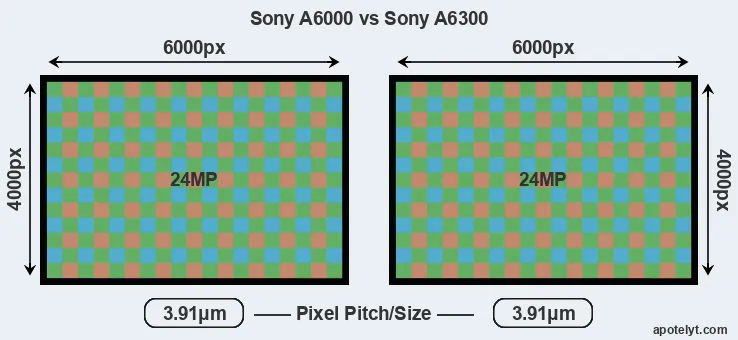 The two cameras under review do not only share the same sensor size, but also offer an identical resolution of 24 megapixels. This similarity in sensor specs implies that both the A6000 and the A6300 have the same pixel density, as well as the same pixel size. It should, however, be noted that the A6300 is a somewhat more recent model (by 1 year and 11 months) than the A6000, and its sensor might have benefitted from technological advances during this time.