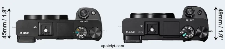 The physical size and weight of the Sony A6000 and the Sony A6300 are illustrated in the side-by-side display below. The two cameras are presented according to their relative size. Three successive views from the front, the top, and the rear are shown. All width, height and depth measures are rounded to the nearest millimeter.
