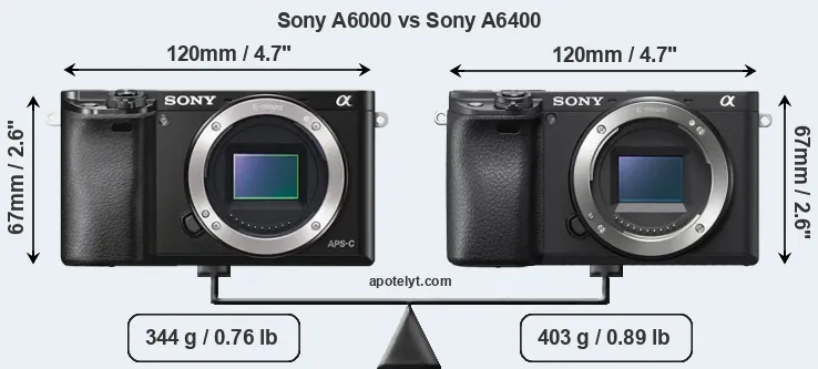 In this particular case, the Sony A6000 and the Sony A6400 have exactly the same width and height, and, thus, have identically-sized bodies. However, the A6400 is markedly heavier (17 percent) than the A6000. It is noteworthy in this context that the A6400 is splash and dust-proof, while the A6000 does not feature any corresponding weather-sealing.