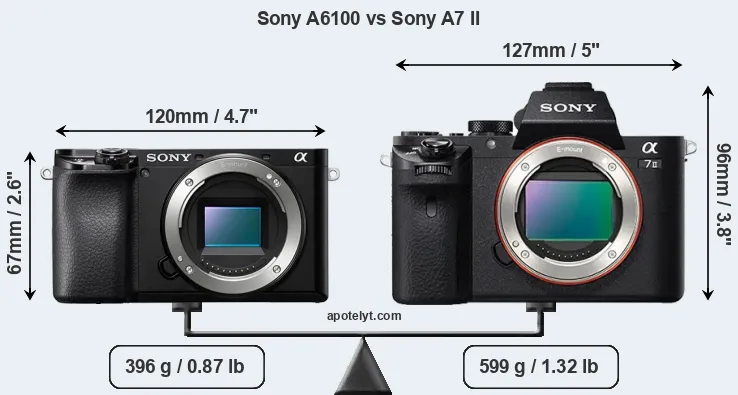 If the front view area (width x height) of the cameras is taken as an aggregate measure of their size, the Sony A7 II is considerably larger (52 percent) than the Sony A6100. Moreover, the A7 II is substantially heavier (51 percent) than the A6100. It is noteworthy in this context that the A7 II is splash and dust-proof, while the A6100 does not feature any corresponding weather-sealing.