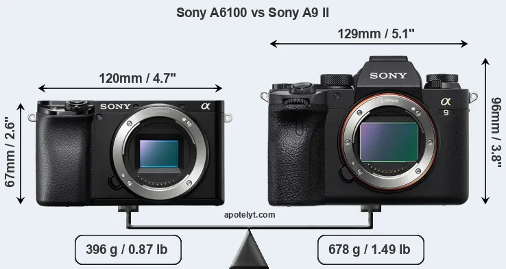 If the front view area (width x height) of the cameras is taken as an aggregate measure of their size, the Sony A9 II is considerably larger (54 percent) than the Sony A6100. Moreover, the A9 II is substantially heavier (71 percent) than the A6100. It is noteworthy in this context that the A9 II is splash and dust-proof, while the A6100 does not feature any corresponding weather-sealing.