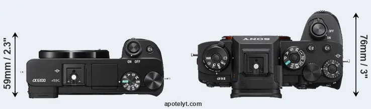 An illustration of the physical size and weight of the Sony A6100 and the Sony A9 II is provided in the side-by-side display below. The two cameras are presented according to their relative size. Three consecutive views from the front, the top, and the rear side are shown. All size dimensions are rounded to the nearest millimeter.