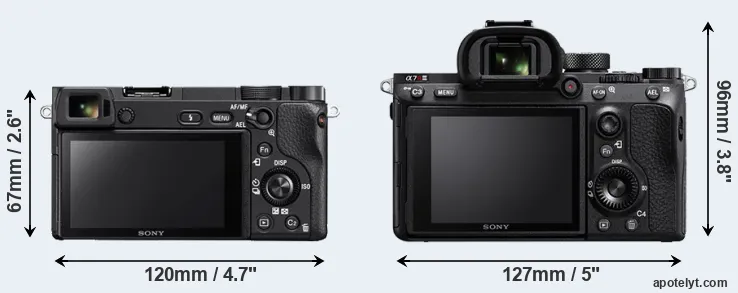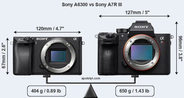 If the front view area (width x height) of the cameras is taken as an aggregate measure of their size, the Sony A7R III is considerably larger (52 percent) than the Sony A6300. Moreover, the A7R III is substantially heavier (61 percent) than the A6300. In this context, it is worth noting that both cameras are splash and dust-proof and can, hence, be used in inclement weather conditions or harsh environments.