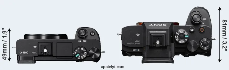 The side-by-side display below illustrates the physical size and weight of the Sony A6300 and the Sony A7S III. The two cameras are presented according to their relative size. Three successive views from the front, the top, and the rear are shown. All width, height and depth measures are rounded to the nearest millimeter.